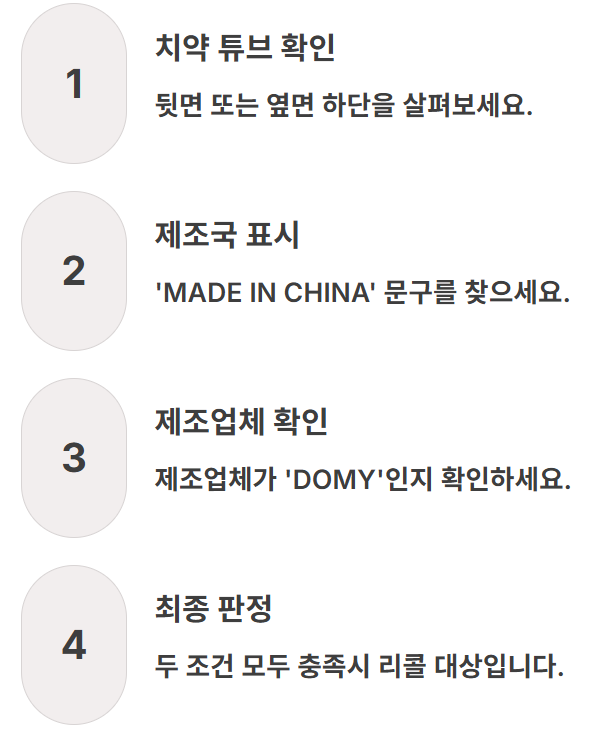 가장 중요한 건 바로 ‘제조국’과 ‘제조업체’를 확인하는 거예요. 치약 튜브 뒷면이나 옆면을 자세히 보시면 ‘MADE IN CHINA’라는 문구와 함께 제조업체로 ‘DOMY’라고 적혀있는지 확인해주세요. 이 두 가지 조건이 모두 충족된다면 리콜 대상 제품이 맞답니다.