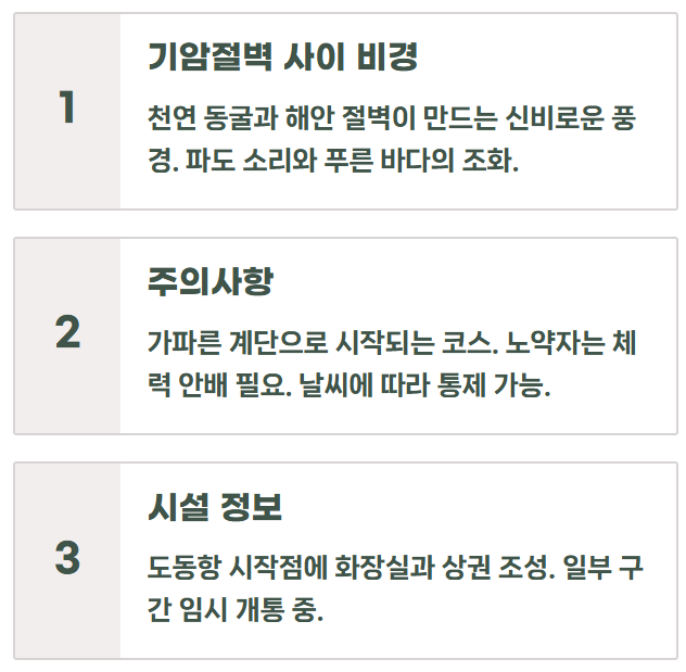 도동항에서 저동 초대바위까지 이어지는 구간으로, 기암절벽과 천연 동굴이 어우러진 풍경을 감상할 수 있습니다.