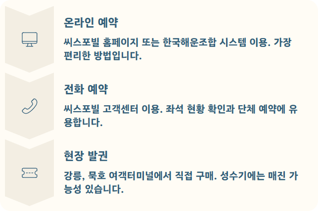 가장 좋은 선택은 오전 출항 편이에요. 바람이 덜 불고 파도가 잔잔해 운항이 안정적이거든요. 왕복표를 미리 예매해 두면 일정 관리도 훨씬 수월하답니다.
