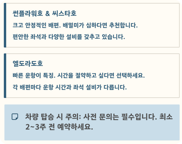 멀미가 걱정된다면 배 중앙 좌석을 선택하고, 출항 30분 전 멀미약 복용을 추천드립니다. 짐이 많을 경우 선박 내 보관함을 활용하면 편리합니다.