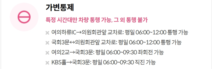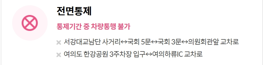 ✔ 통제 구간: 국회 뒤편 여의서로(1.7km), 서강대교 남단 공영주차장~여의 하류IC